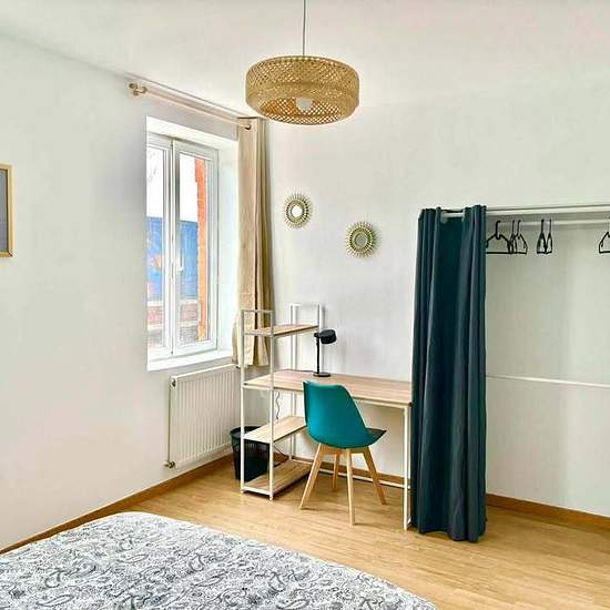 Chambre dans colocation neuve 2 mn à pied du métro Roubaix-CDG Maison entièrement rénovée de 110 m2, à 2 mn à pied du métro (15 mn du centre ville de Lille en métro), comprenant: 5 chambres privatives de 10 à 14 m2, 3 salles de bain et toilettes, cour extérieure. Les chambres disposent chacune d'un double sommier et matelas 140*200, grand dressing armoire, bureau, chaise, table de chevet, linge de lit inclus. Chaque chambre est sécurisée avec un verrou et clé personnels. Deux chambres (10 et 14 m2) actuellement disponibles à compter de Janvi...