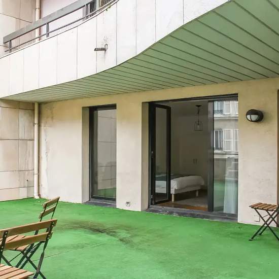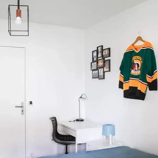 Room of 11m², fully furnished. It has a double bed (140x190) and a bedside table with lamp. A working area is included, composed of a desk with chair and lamp. The room also offers several storage spaces: a wardrobe with hanging space and a shelf. The main feature of this room is the access to the balcony. Located in the Les Martinets district, this 136m² apartment is ideally situated, just a stone's throw from the Le Patio shopping center and the RER station and close to all amenities. The apartment is on the 1st floor of a secure building ...