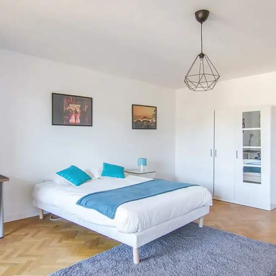 Very large room of 24m², fully furnished. It has a double bed (140x190) and a bedside table with lamp. A working area is included, composed of a desk with chair and lamp. The room also offers several storage spaces: a wardrobe with hanging space and a shelf. The main features of this room are the sofa that composes it and the access to the balcony. Located in the Les Martinets district, this 136m² apartment is ideally situated, just a stone's throw from the Le Patio shopping center and the RER station and close to all amenities. The apartmen...