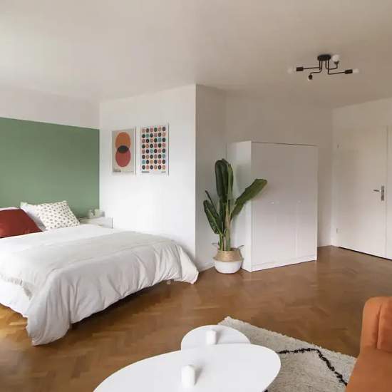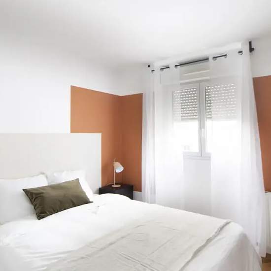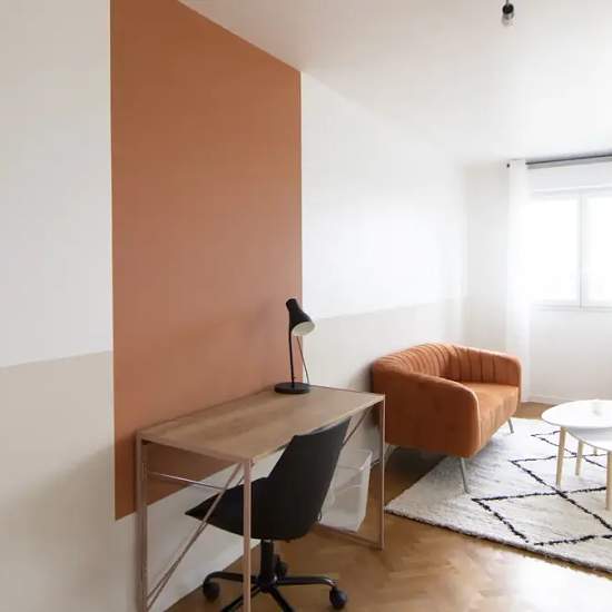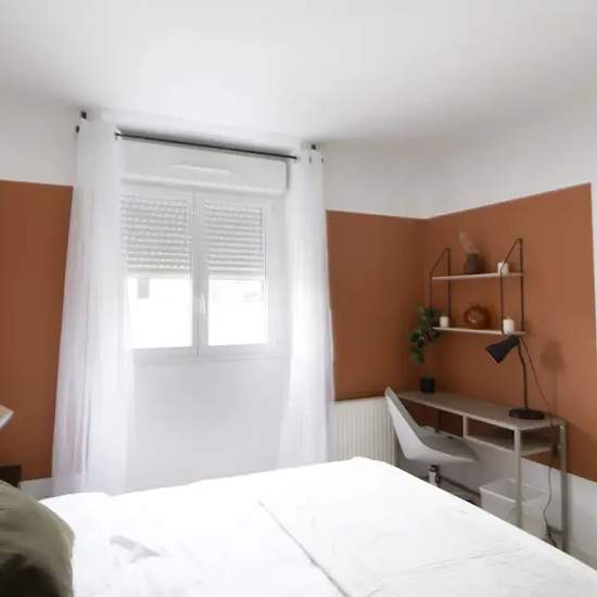 Discover this pleasant 10 m² bedroom, located in a beautiful 69 m² apartment fully equipped and in coliving, in Saint-Denis. This beautiful bedroom is on the 6th floor. Its decoration in the blue and ochre tones will not leave you indifferent. This natural and tonic atmosphere's bedroom includes two distinct spaces: the first one is dedicated to the night. It includes a double bed, a table and a bedside lamp. The second is a work space. It includes a desk and all the essentials: shelves, chair, and lamp. Finally, it offers a closet and all t...