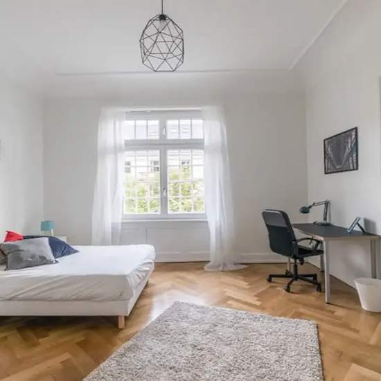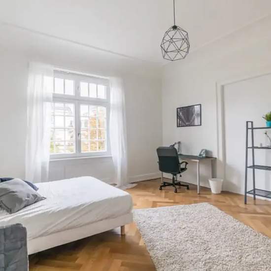 Very large room of 22m², fully furnished. It has a double bed (140x190) and a bedside table with lamp. A work area is included, composed of a desk with chair and lamp. The room also has storage space: a wardrobe with hanging space and a shelf. The room also has a sofa. Located in the Kable district, this 133m² flat is ideally located, a few steps from the Parc du Contades and the République station and close to all amenities. The flat is on the 1st floor of a secure building with a bicycle locker. The flat is composed of 5 rooms, a kitchen, ...